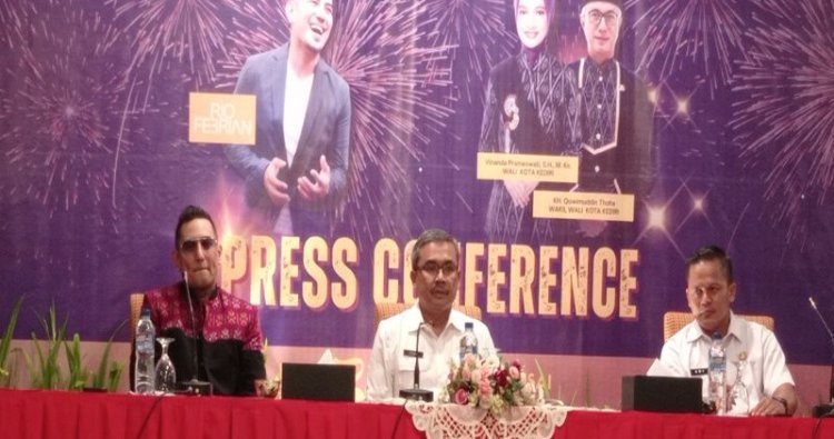 Kediri - Pemerintah Kota Kediri melalui Kepala Dinas Kominfo Kota Kediri Rony Yusianto didampingi Kabag Prokopim Adi Sutrisno bersama Rio Febrian menggelar konferensi pers agenda Penataan Kawasan Jalan Stasiun Kediri dan Malam Pergantian tahun baru 2026 serta Makan Bareng Mbak Wali Pecel bersama warga disiapkan 2000 pecel gratis bertempat di Grand Surya Hotel, Rabu (31/12/2025).